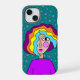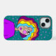 Diseño colorido, luminoso y abstracto de la cara estilizada de un chica de pelo rayado, con un fondo de estrellas.