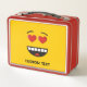 Una cara con corazones en lugar de ojos usados como expresión de amor. Texto personalizado.