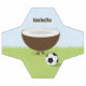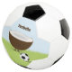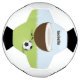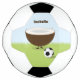 Una pelota de fútbol con un personaje sonriente de coco que está parado con una pelota de fútbol. El diseño también tiene un nombre de personalizable.
