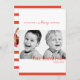 tarjeta de plantilla de dos fotos de Navidad. Brillantes rayas rojas y blancas agregue su propia foto en la parte delantera y trasera de la tarjeta y personalice con el nombre de su familia.