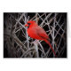 El pájaro cardenal rojo brillante está encaramado en un arbusto con pequeñas ramas alrededor.