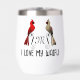 Este es un ilustracion de un par de cardenales del norte. El pájaro cantante masculino es en su mayoría rojo con una cara negra y un pico rosado rojizo. La hembra es un marrón suave con toques de rojo, con un pico rojo.