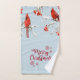 Pájaro cardenal rojo sobre ramas de pinos con bayas huecas sobre un fondo blanco.