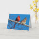 Una tarjeta de felicitación en blanco dentro de la cual aparece una foto de un cardenal varón y una hembra encaramado en una rama de abedul.
