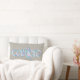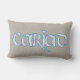 Una divertida almohada lumbar con la palabra galesa 'cariad' en un guión celta, llena de un patrón floral de bonito delineado en azul brillante sobre un fondo de color hesse (burlap).