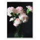 Hermosas flores blancas de clavel con bordes rosas sobre un fondo negro.