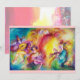 Pintura abstracta figurativa en acuarela, colorida y caprichosa, con figuras bailando, músicos, disfraces de carnaval vibrantes, máscaras emplumadas en colores rosa brillante, fucsia, verde, rojo, azul y amarillo, inspirada en la Comedia del Arte (Commedia dell'arte), máscaras italianas y Carnaval de Venecia.