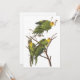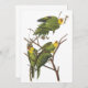 Este es un grupo de cuatro Carolina Parakeets sentados en una rama. Hay tres hombres y una mujer. La hembra es verde mientras que los machos tienen cabezas amarillas brillantes con rojas alrededor y entre sus ojos.