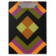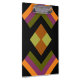 Diseño audaz con un diamante verde y marrón en el medio y triángulos en púrpura verde y naranja en la parte superior e inferior.