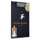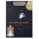 Astronauta personalizado y lanzadera espacial hacia la luna en una galaxia negra purpurina de imitación dorada estrellada. El texto de la tipografía del tipo de letra de la edad del espacio se puede personalizar fácilmente con el nombre y el número de teléfono de su hijo. Una escuela fresca o un Portapapeles en casa para los niños que aspiran a exploradores de los misterios del sistema solar.
