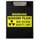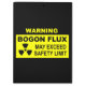 Un signo de advertencia negro y amarillo con texto que diga: "ADVERTENCIA, FLUJO DE BOGÓN, PUEDE SUPERAR EL LÍMITE DE SEGURIDAD". También aparece un símbolo de advertencia de material radiactivo. El bogón es una partícula elemental que tiene la propiedad de la bogosidad, o de ser falso (es decir, falso de mal). Todos los seres humanos son emisores naturales de bogones de bajo nivel. Los niveles de emisión fluctúan con el tiempo. Los políticos, otros individuos como vendedores de autos usados, son fuentes de bogones de alto nivel. Cuando esos individuos emiten niveles extremadamente altos de magnitudes, como cuando hacen promesas de campaña, puede ocurrir un gran flujo. Un flujo de bogones puede ser muy peligroso para los que están en la zona. Bogon originalmente era una jerga de hackers que tenía que ver con direcciones falsas en una red de computadoras.