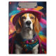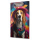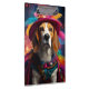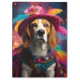 Un Beagle juguetón vestido con un disfraz vibrante y caprichoso contra un telón de fondo brillante y mágico. Este encantador diseño es perfecto para los amantes de los animales.