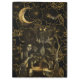Observen esta composición gótica de brujas y brujas, elementos dorados sobre un fondo negro con un patrón de flor de loto.