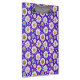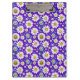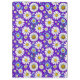 Un colorido patrón sin costuras con margaritas con centros amarillos, hojas azules y un fondo violento púrpura. Perfecto para temas primaverales, diseños textiles y alegres artesanías digitales o impresas.