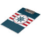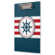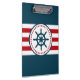 Diseño náutico con decoración de ruedas de vela en forma redondeada con estrellas sobre fondo rayado rojo, azul y blanco