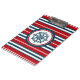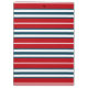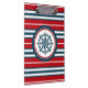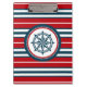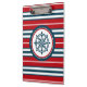 Diseño náutico con decoración de brújula en forma redonda sobre fondo rayado rojo, azul y blanco