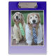 Este portapapeles muestra una fotografía de dos sonrientes perros recuperadores de oro que llevan camisetas de vestir masculinos y corbatas brillantes. Añade el nombre de su empresa al fondo, si lo desea.