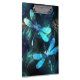 Dos libélulas transparentes, luminosas, turquesas, dibujadas de forma artística sobre el fondo nocturno con algas lacustres luminosas y luciérnagas. Flauta de dragón resplandeciente.
