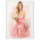 A beautiful woman in a flowing pink dress holds a bouquet of flowers and a pair of high heels in this elegant watercolor illustration.