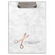 Diseño moderno y elegante para los peinados con tijeras de oro rosa falsas, fuente caligráfica elegante y fondo de mármol blanco.
