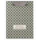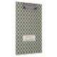 Este diseño presenta un patrón de cuatrefoil marroquí en ambos lados del portapapeles. El fondo verde de liquen profundo se combina perfectamente con el crujiente motivo de la hoja de quatreil blanca. Situado justo debajo del centro, en la parte delantera, un suave rectángulo de color beige-crema con bordes delgados en blanco y negro ofrece espacio para la personalización. Ya sea su nombre, logotipo de la empresa o una cita, este diseño proporciona un lienzo para la personalización. Los tipos de letra y los colores se seleccionan cuidadosamente para alinearse con la estética moderna, haciéndolo adecuado para diversos propósitos, desde presentaciones de negocios hasta organización personal.
