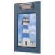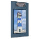 Diseño de temática náutica con decoración de faro acuático en un marco azul oscuro. Es posible cambiar el color de fondo y añadir uno diferente al diseño con su elección.