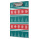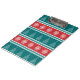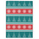 Feliz ilustracion navideño con árbol de Navidad y decoración de copos de nieve sobre fondo rayado rojo, blanco, azul y turquesa