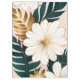 Un gran dibujo en línea de una flor blanca, delineada en oro, con hojas verdes y doradas tipo helecho, y un fondo de melocotón cálido hacen una hermosa cubierta en este cuaderno.