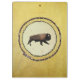 Se pinta un bisonte galopante en el lado de la piel de una pelta de castor estirada en un aro de sauce. El bisonte (Bison bison), el mamífero terrestre más grande de Norteamérica, es considerado una especie clave: una vez recorrieron el continente en grandes rebaños, y su presión de pastoreo ayudó a dar forma a la ecología de las Grandes Llanuras. Se han descrito dos subespecies o ecotipos: el bison de las llanuras (Bison bison bison bison), de menor tamaño y con una joroba más redondeada, y el bisonte de madera (Bison bison athabascae), el mayor de los dos y con una joroba cuadrada más alta. El bisonte es un relativamente recién llegado a Norteamérica, habiendo nacido en Eurasia y migrado por el estrecho de Bering Hace unos 10.000 años reemplazó al bisonte de estepa (Bison priscus), un inmigrante anterior que era mucho más grande. Se cree que el bisonte de estepa se extinguió debido a un ecosistema cambiante y a la presión de la caza tras el desarrollo del punto Clovis y la tecnología conexa, y a la mejora de las habilidades de caza. Durante ese mismo período, otros megafauna desaparecieron y fueron sustituidos en cierta medida por animales eurasiáticos inmigrantes que estaban mejor adaptados a los seres humanos predadores. El bisonte existente, técnicamente una forma enana, era uno de estos animales. Hubo una vez un estimado de 20 a 30 millones de bisontes, también llamados búfalos, vagando por Norteamérica. Su rango alguna vez comprendía aproximadamente un triángulo entre el Gran Lago Oso en el extremo noroeste de Canadá, al sur de los estados mexicanos de Durango y Nuevo León, y al este a lo largo de la frontera occidental de las montañas Apalaches. Las primeras autopistas de América del Norte, excepto las de mastodonte o musko, abandonadas por el tiempo, fueron los rastros de bisonte y ciervo en la migración estacional y entre los campos de alimentación y las salinas. Muchas de estas rutas, martilladas por innumerables pezuñas que siguen instintivamente las cuencas y los escudos de las crestas para evitar la mugre de verano de los lugares bajos y los cambios de nieve de invierno, fueron seguidas por nativos estadounidenses y fueron inestimables para los exploradores. El término "búfalo" puede ser considerado un nombre erróneo para este animal, ya que está muy relacionado con cualquiera de los dos "búfalo verdadero", el búfalo de agua asiático y el búfalo africano. Sin embargo, "bison" es una palabra griega que significa animal parecido a un buey, mientras que "búfalo" se originó con los zapatillas de piel franceses que llamaron a estas bestias masivas borregas, lo que significa buey o bullock, por lo que los dos nombres, "bison" y "búfalo", tienen un significado similar. En referencia a este animal, el término "búfalo", que data de 1635, tiene una historia mucho más larga que el término "bisonte", que se registró por primera vez en 1774. El bisonte estadounidense está más estrechamente relacionado con el capricho o el bisonte europeo. El tiroteo no regulado de bisontes, que culminó en matanzas masivas durante la década de 1870, redujo la población a 1,091 en 1889. Hoy, aproximadamente 500.000 bisontes viven en toda América del Norte. La mayoría no son puros bisontes, sino que han sido cruzados con ganado en el pasado y se crían como ganado en ranchos. Menos de 30.000 bisontes se encuentran en rebaños de conservación, y menos de 5.000 son de libre alcance y están libres de enfermedades. Hoy en día, los bisontes están ecológicamente extintos a lo largo de la mayor parte de su rango histórico, excepto por unos pocos parques nacionales y otras pequeñas áreas de vida silvestre. El Parque Nacional Yellowstone tiene la mayor población de bisonte de planicies en itinerancia libre (cerca de 4,000), y el Parque Nacional Búfalo de Madera tiene la mayor población de bisontes de madera en itinerancia libre (cerca de 10,000). Un bisonte tiene un abrigo de invierno oscuro, largo y oscuro, y un abrigo de verano marrón más ligero y ligero. El abrigo de invierno es tan grueso y está tan aislado que la nieve puede cubrir sus espaldas sin derretirse. El bisonte masculino es ligeramente mayor que el femenino. El bisonte de llanuras suele pesar de 700 a 2200 libras. El toro salvaje más pesado jamás registrado pesaba 2.800 libras. Cuando se cría en cautiverio y se cultiva para la carne, el bisonte puede crecer poco naturalmente pesado y el bisonte semi-doméstico más grande pesaba 3.800 libras. Las cabezas y los cuartos delanteros son masivos, y ambos sexos tienen cuernos cortos y curvos que pueden crecer hasta 2 pies de largo, que usan para luchar por la condición dentro del rebaño y para la defensa. Los venados son herbívoros, pastos en las hierbas y setas de las praderas norteamericanas. Su horario diario incluye periodos de dos horas de pastoreo, descanso y mascado de caña, y luego se mudan a un nuevo lugar para pastar de nuevo. Este movimiento regular asegura que los bisontes rara vez pastan en exceso una zona. Bison suele frotarse y rodar en el suelo creando depresiones superficiales, como platillos, llamadas wallow. El veneno se enrollará en el macizo, mojado o seco, cubriéndose con polvo o barro. Las explicaciones pasadas y las hipótesis actuales sugeridas para el comportamiento de retorcer incluyen el comportamiento de retorcimiento asociado con el desprendimiento, la interacción macho-macho (normalmente el comportamiento de descomposición), el comportamiento social para la cohesión de grupo, el comportamiento del juego, el alivio de la irritación cutánea debido a insectos mordaces, la reducción de garrapatas y piojos y la termorregulación. Las hormigas fueron una vez una característica común de las llanuras. En invierno, bison puede excavar en la nieve profunda con la cabeza para llegar a la vegetación de abajo. Los venenos tienen mala vista, pero tienen audición aguda y un excelente sentido del olfato.