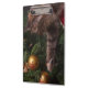 El diseño presenta una fotografía de un gato que busca una decoración en un árbol de Navidad.