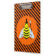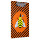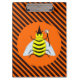 Este impresionante portapapeles presenta una adorable bruja de abejas amarillas con rayas negras. El Bee tiene grandes rayas negras brillantes y lindas antenas negras. Las alas de la abeja están dobladas para que se vean como una capa. La abeja lleva puesto un alto gorra de brujas negras con estrellas naranjas y moradas. Además, está sosteniendo una varita mágica con forma de estrella y con muchos colores diferentes. El fondo es un patrón de rayas naranjas y negras.