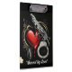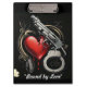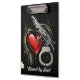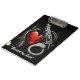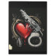 Este vintage ilustracion blanco y negro muestra una esposas y una pistola junto a un corazón rojo sangrante, colocado sobre un fondo oscuro con acentos de luz suave. Los toques dorados agregan elegancia, capturando los intensos temas del amor y el conflicto. "Imagen original generada por Meta AI. La IA generó obras de arte. Con licencia CC BY-SA 4.0.