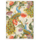Postal de ilustraciones de pavo real y cachorros. Patrón colorido vintage con pavos reales azules y adornos rojos y morados.