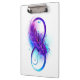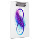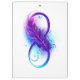 Símbolo infinito con una hermosa pluma pintada de color violeta y azul brillante sobre fondo blanco.