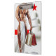 Navidades de SlipperyJoe comprando un árbol de espirales de papel blanco coronado por una vibrante estrella roja que golpea el tema de las vacaciones atrevida banda de escarlata corriendo horizontalmente sexy hombre muscular de pecho parcialmente vestido hoja de cama artística sin camisa regalo de tipo bolsos de compras estacionales regalos de orgullo gay alegrías LGBTQIA