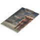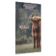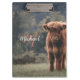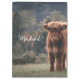 Fotografía del campo de hierba de ternera de vaca de la región montañosa del otoño. Impresionante ternera joven de ganado escocés de tierras altas en un campo de hierba otoñal con colores apagados. Hermoso abrigo naranja peludo oscuro que contrasta con el césped verde claro amarillo y los árboles en el fondo. Monograma personalizable por personalizado con su nombre e inicial a la izquierda.