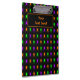 Este portapapeles tiene un patrón geométrico de arañas en colores naranjas, púrpura y verde brillantes sobre un fondo negro, que coincide con el frente y el reverso. Hay espacio en el frente para que lo personalizes con tu propio texto.