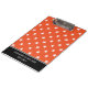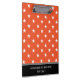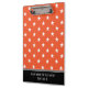 Este elegante diseño se despliega sobre un lienzo dividido en dos colores distintos: naranja de tangerina sobre la parte superior y negro en la parte inferior. A través de este sorprendente fondo, un exquisito patrón de estrellas blancas grava ambos lados del portapapeles. La selección de colores sigue las últimas tendencias de moda, permitiendo que el naranja tangerino de tango se complemente y contraste maravillosamente con las estrellas blancas. Situado en la parte inferior del frente, nuestro diseño único presenta un banner rectangular de personalizable en negro, enmarcado por bordes delgados y adornado con texto blanco. Personalízalo con tu nombre, nombre de la empresa o un mensaje conciso de dos líneas.