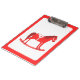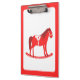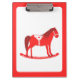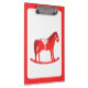 Este impresionante portapapeles de Navidades presenta una imagen de arte digital de un lindo caballo balancín al estilo escandinavo. El caballo es rojo con un mané rojo oscuro, cola y pezuñas. El caballo amistoso sonríe. Tiene una silla blanca y riendas con motivos folclóricos escandinavos bonitos en la silla, incluyendo el sol, la luna y las estrellas y los corazones y flores. La base del mecedor es roja y está cubierta de hojas blancas de bonito. El diseño se inspiró en el caballo Dala sueco.
