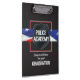 Una placa policial enmarca las palabras - Academia de Policía. Con un fondo negro, las palabras destacan para felicitar a un oficial por su graduación. Detrás de la insignia se ve una bandera con una mirada estridente sobre las palabras y la bandera que significa el ardor y el arduo trabajo de un agente de las fuerzas del orden. ¡Envíen sus mejores deseos y felicitaciones al nuevo oficial de policía por su graduación en la Academia de Policía! Puedes personalizar el nombre de este por ese toque personal.