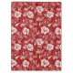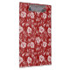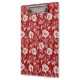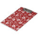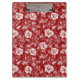 Este portapapeles presenta un diseño floral de estilo barroco en blanco sobre rojo.