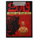 En un cuadrado hay dos cerdos: uno (estilo chino de papeleo negro) parece salirse con una forma de papeleo dorado (dentro está el segundo cerdo con el símbolo chino). Detrás de ellos hay un fondo rojo formado por grandes letras decorativas y ornamentadas con las palabras: "Año del cerdo" y en la parte superior "Año del cerdo" + gran 2019. Diseño en portapapeles con fondo negro. Puede cambiar fácilmente el año (fuente, color, tamaño y posición) haciendo clic en el botón personalizar. Productos de oficina, productos para el hogar, tarjetas de felicitación, postales, productos artesanales y más. Perfecto para el Año Nuevo Chino 2019 del Cerdo o cumpleaños (personas nacidas en el año del Cerdo).
