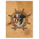 ¡Aargh! Piratee el cráneo, el remiendo del ojo, el gorra del pirata, y las espadas cruzadas sobre la rueda de una nave de madera antigua en un mapa náutico del vintage.