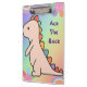 Un portapapeles con fondo de arcoiris y Dinosaurio en la parte delantera. Viene con una cita motivacional, pero si sientes la necesidad de personalizarla o cambiarla a algo que te guste, puedes hacerlo. Adelante y compre para su hijo; estoy seguro de que lo adorarán.