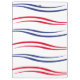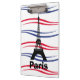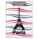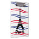 Ilustracion de la Torre Eiffel sobre fondo ondulado azul, blanco y rojo
