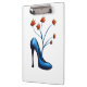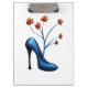 Portapapeles de zapatos de tacón alto con un ilustracion digital de un zapato azul con flores creciendo de él en azul, naranja vibrante y fondo blanco personalizable. Diseño de moda con un toque de humor para un chica elegante de moda.