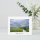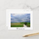 Postal de un sinuoso camino de tierra 'strada bianca' con muchas curvas a través de los campos verdes en un paisaje de la Toscana con un árbol a lo largo del camino y hermosas nubes en el cielo que llevan a un destino a lo lejos con un borde blanco y el texto: 'Toscana'.