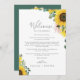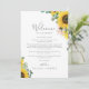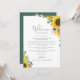 Estas rústicas cartas de bienvenida y tarjetas itinerantes de los bodas de girasol son perfectas para una boda rural. El diseño floral bohemio incluye girasoles amarillos, flores rosas y un eucalipto verde cazador en la acuarela con un elegante y moderno toque boho. La parte delantera de la tarjeta incluye una carta de bienvenida y la parte trasera de la tarjeta incluye el itinerario del boda. Estas notas son perfectas para bodas de destino y bolsos de bienvenida para huéspedes del hotel.
