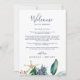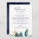 Estas modernas cartas de bienvenida e itinerarios de boda náutico son perfectas para una boda de crucero o de playa. El diseño botánico presenta hermosas hojas verdes con flores de la marina y acentos de estrella de oro, lo que le da un ambiente de playa. La parte delantera de la tarjeta incluye una carta de bienvenida y la parte trasera de la tarjeta incluye el itinerario del boda. Estas notas son perfectas para bodas de destino y bolsos de bienvenida para huéspedes del hotel.
