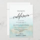 Estas cartas de bienvenida y tarjetas itinerarias de la playa de la playa de Aqua California son perfectas para una boda de destino tropical. El diseño es sencillo y moderno, con una impresionante acuarela turquesa, verde azulada y azul claro con un suave brillo dorado que recuerda a la arena y al mar. Está emparejado con una caligrafía elegante y preciosa. La parte delantera de la tarjeta incluye una carta de bienvenida y la parte trasera de la tarjeta incluye el itinerario del boda. Estas notas son perfectas para bodas de destino y bolsos de bienvenida para huéspedes del hotel. Nota: Este diseño no tiene purpurina de oro real. Es un gráfico de alta calidad hecho para parecerse a un brillo dorado brillante.